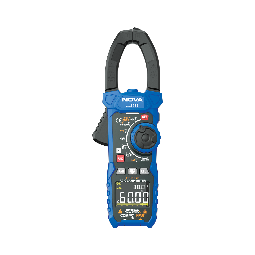 مولتی متر کلمپی 1002 ولت نووا مدل 1924 AC دیجیتال، با ظرفیت 1002 ولت، ابزاری دقیق و چندمنظوره برای اندازه‌گیری جریان AC تا 1000 آمپر، ولتاژ AC، مقاومت، فرکانس، دیود، خازن و دما است. این دستگاه با فک بازشونده تا قطر 35 میلی‌متر امکان تست جریان در کابل‌ها و سیم‌های ضخیم را فراهم می‌کند و مجهز به تستر ولتاژ غیرتماسی (NCV) و فازمتر تماسی است. سیستم محافظت در برابر اضافه‌بار، ورودی با امپدانس پایین برای کاهش خطاهای ناشی از ولتاژهای القایی و فیلتر پایین‌گذر (LPF) برای افزایش دقت اندازه‌گیری سیگنال‌های موتور و ترانسفورماتور، امنیت و دقت بالای عملکرد را تضمین می‌کنند.